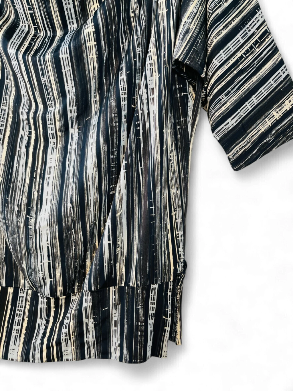 Elegante, versátil y con un diseño que estiliza. Esta blusa con escote drapeado y estampado de líneas en tonos neutros es ideal para el día o la noche.